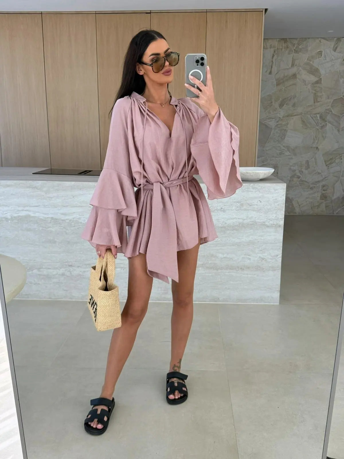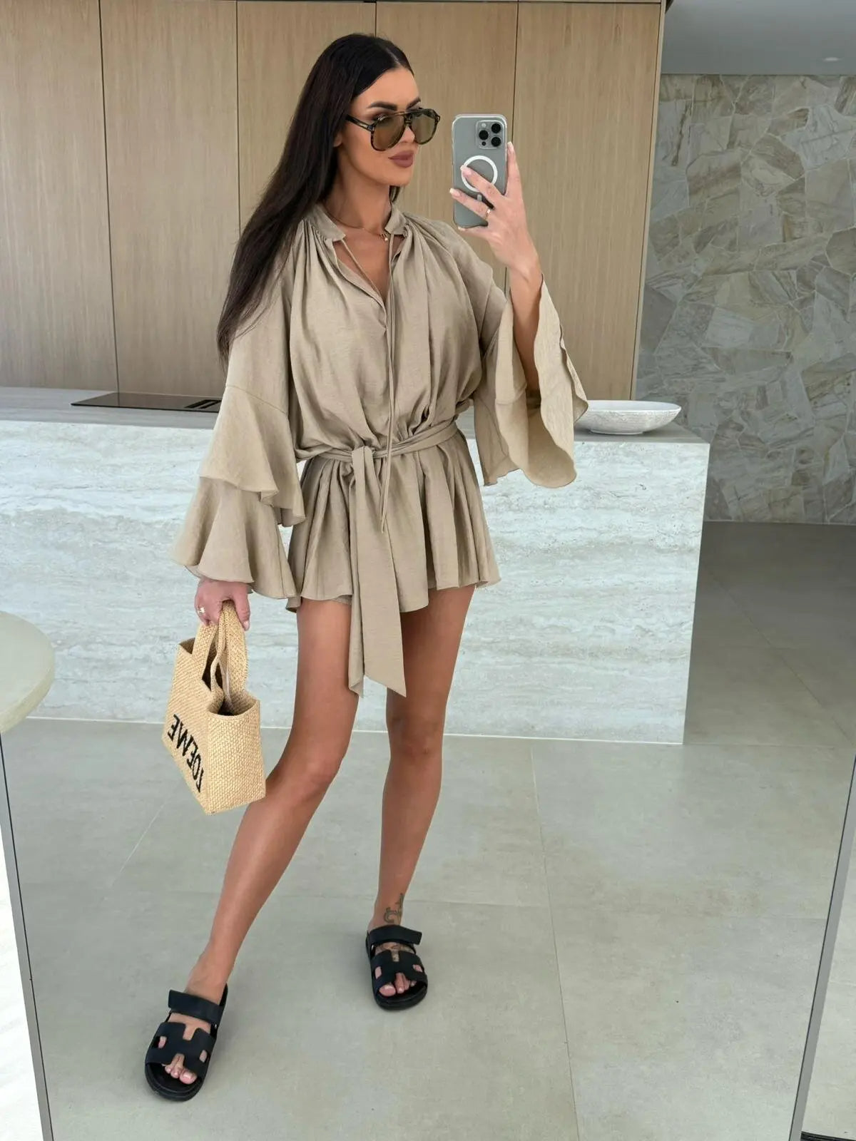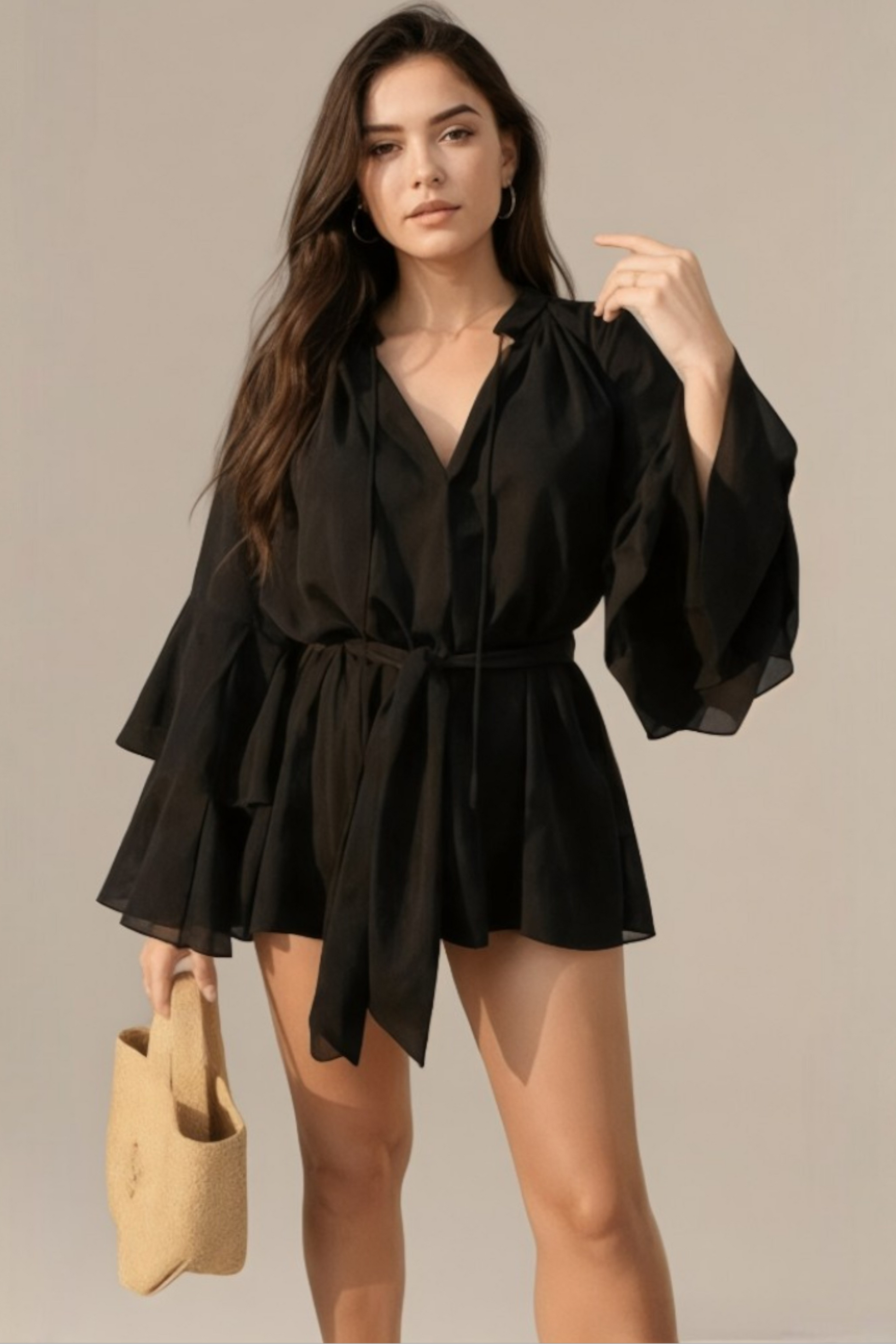 A lightweight, breathable romper with a feminine silhouette, deep V-neck, and dramatic ruffle sleeves. Perfect for beach days, brunch, or warm summer nights.